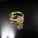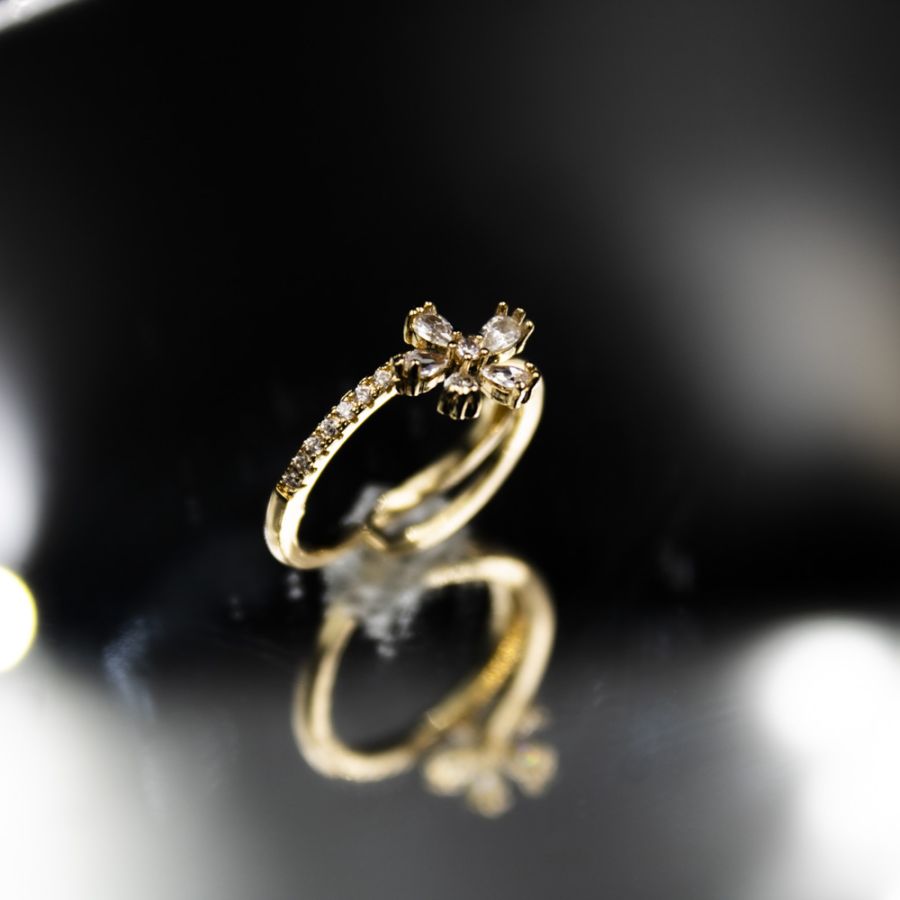خاتم فاخر مطلي بالذهب بتصميم وردة رقيقة مرصعة بفصوص الزركون اللامعة مع أسلوب مزدوج للحلقة يمنحه طابعاً أنثوياً وراقياً. إكسسوار خالد يجمع بين الرقي والأنوثة في جميع المناسبات.